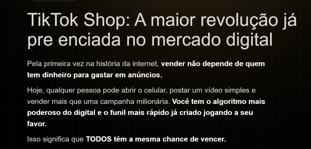 Cada módulo ensina o passo a passo para criar, posicionar e vender produtos dentro do TikTok Shop, mesmo que o aluno nunca tenha feito uma venda online antes.